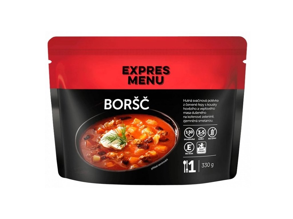 Složení: hovězí vývar (voda, hovězí maso a kosti), hovězí maso přední, rajčatový protlak (voda, rajčatový protlak, sůl), zelí hlávkové, červená řepa sterilovaná (červená řepa, voda, ocet, cukr, sůl, aroma), vepřové maso (plec), smetana, rýžová mouka, kukuřičná mouka, kořenová zelenina (mrkev, celer, pastinák, petržel), brambory, cukr, cibule, uzená slanina (vepřové sádlo), citron, sůl kamenná, paprika mletá, bobkový list.