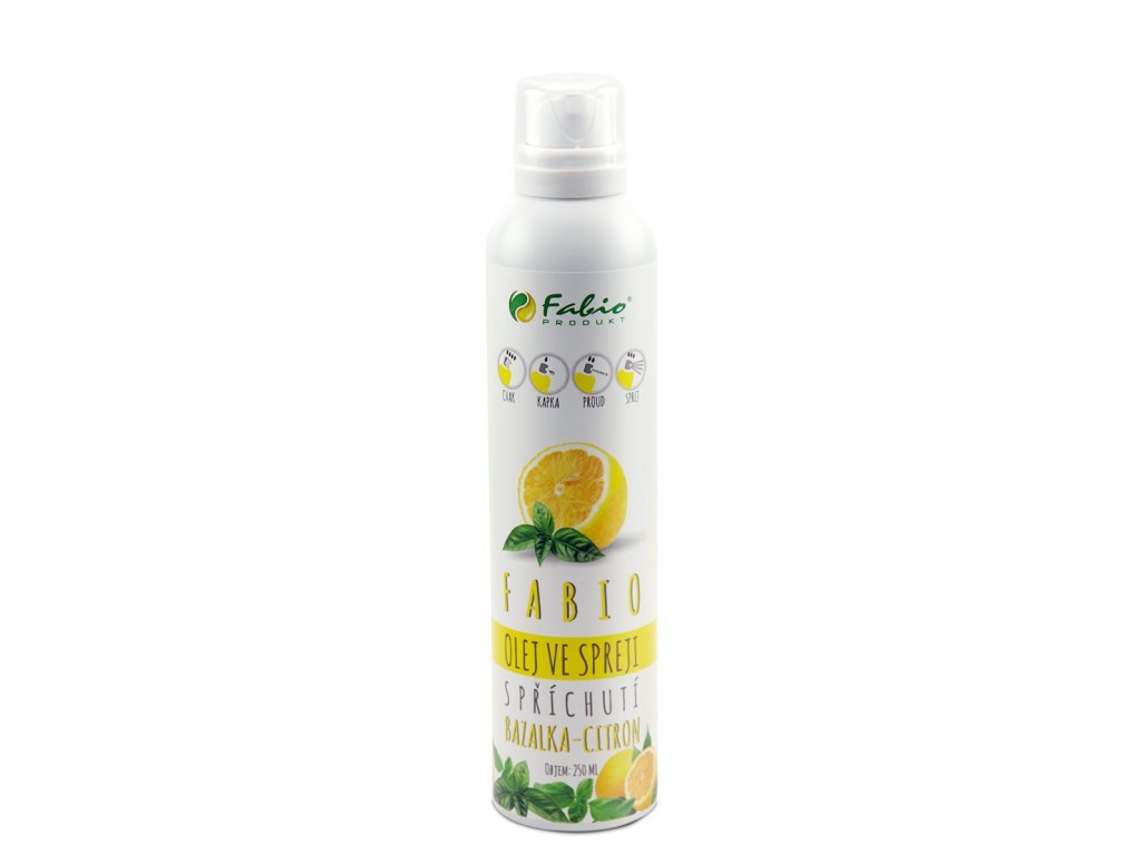 Olej ve spreji FABIO bazalka-citron je řepkový olej s vyváženou kombinací bazalkové a citronové příchuti. Řepkový olej je vhodný ke každodennímu užití především díky příznivému složení mastných kyselin, konkrétně vysokému obsahu omega-3 nenasycených mastných kyselin. Aplikací pomocí spreje olej rovnoměrně rozprostřete po celém jídle a i ostatní 2 polohy střiku (kapka, proud) vám skvěle usnadní vaření.