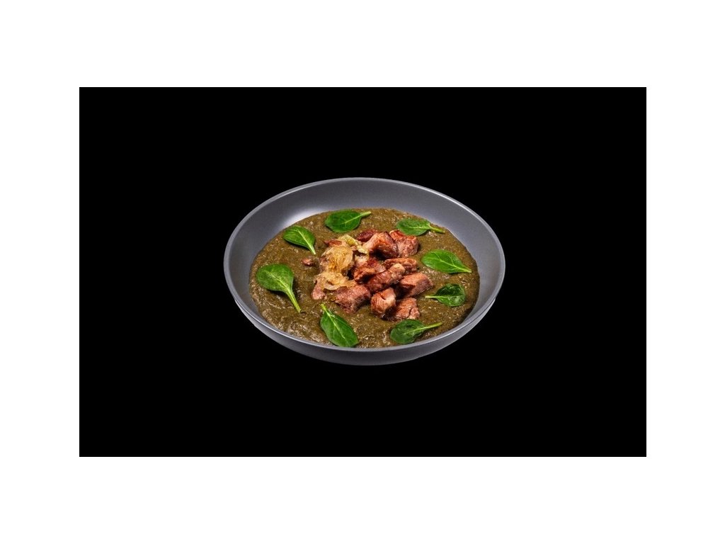 Složení: Špenát (59%), vepřové maso (30%), vývar (mrkev, celer, cibule, pepř, česnek, sůl, libeček, kuř. skelet, vepř. kosti, hov. ořez), rýžová mouka, smetana, sádlo, kmín. Může obsahovat stopy lepku.