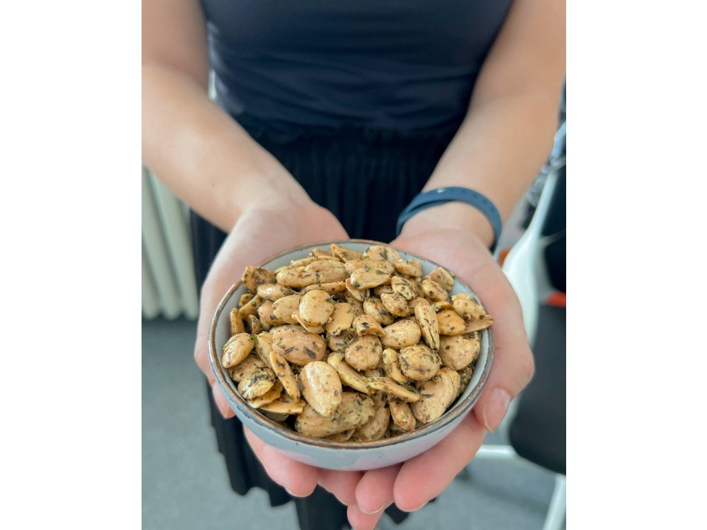 Každá jedna mandle je s láskou upražena v jemném slunečnicovém oleji, který jejich přirozenou sladkost dokonale doplňuje. Poté jsou jemně posypané prvotřídní mořskou solí, která jejich chuť ještě umocňuje. Výsledkem je luxusní pochoutka, která dokáže proměnit běžnou chvilku v gurmánský zážitek. Jako třešnička na dortu přišly nakonec na řadu voňavé bylinky. Pražené mandle s bylinkami a solí patří na každý večer s přáteli a ze stolu zmizí rozhodně jako první.
