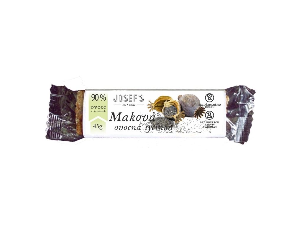 Ovocná tyčinka ochucená mákem Ovocná tyčinka je vhodná jako rychlá svačinka do kapsy. Tyčinka je bez přidaných cukrů a neobsahuje žádná barviva.