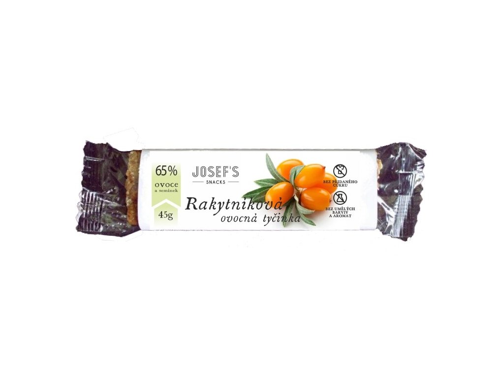 Ovocná tyčinka s rakytníkem je vhodná jako rychlá svačinka do kapsy. Rakytník řešetlákový je známý pro svůj vysoký obsah vitamínů, především vitamínu C. Má až 10x více vitamínu C než pomeranč.Tyčinka je bez přidaných cukrů a neobsahuje žádná barviva.