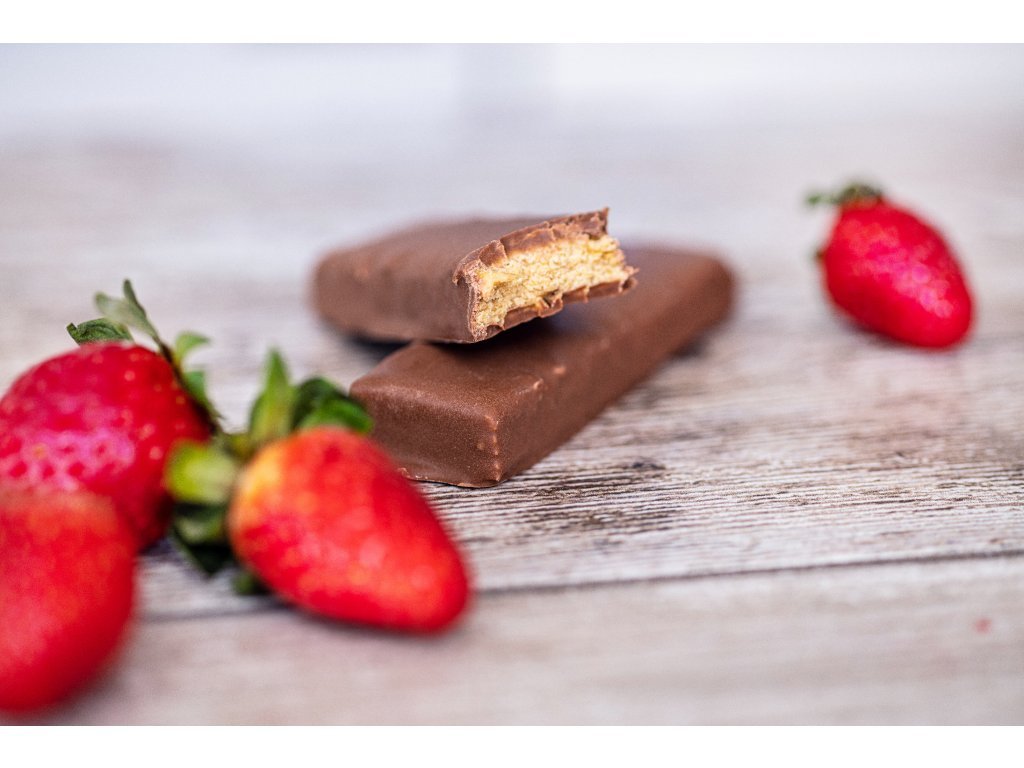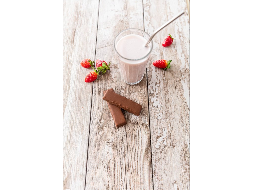 Složení: Oligofruktóza, kakaová poleva 19% (palmový tuk, zahušťovadlo: polydextróza (vláknina), mléčné bílkoviny, kakaový prášek 8%, emulgátor: slunečnicový lecitin, aroma, sladidlo: sukralóza), syrovátkový bílkovinový koncentrát 11%, sójový bílkovinový izolát 10%, sójové vločky, sušené jablka (obsahuje antioxidant: oxid siřičitý), zvlhčovadlo: glycerol, sušené mléko odstředěné, palmový tuk, sušené vaječné bílky, jahodový koncentrát 0,6%, emulgátor: slunečnicový lecitin, sůl, vitaminy: vitamin C (kyselina L-askorbová), vitamin E (DL-alfa-tokoferyl-acetát 50 %), niacin (nikotinamid), vitamin B5 (D-pantothenát vápenatý), vitamin B2 (riboflavin), vitamin B6 (pyridoxinhydrochlorid), vitamin B1 (thiaminmononitrát), vitamin B9 (kyselina pteroylmonoglutamová), D-biotin, vitamin B12 (kyanokobalamin); aroma.