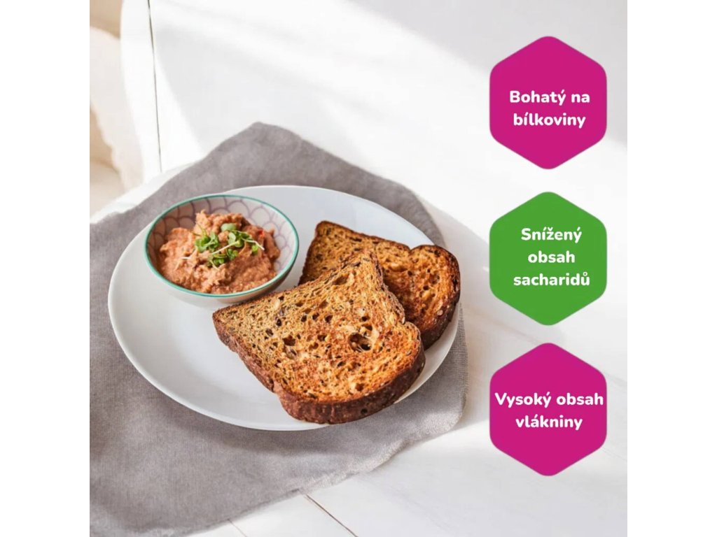 Se správným pečivem se nemusíte omezovat ani při keto nebo low carb dietě. S naším proteinovým toastovým chlebem si budete pochutnávat a hubnout zároveň. Tento skvělý dietní toastový chleba, plný lněných, slunečnicových a sezamových semínek, se hodí jak k namazání našimi výbornými pomazánkami a džemy, tak jako příloha k salátům či hotovkám.