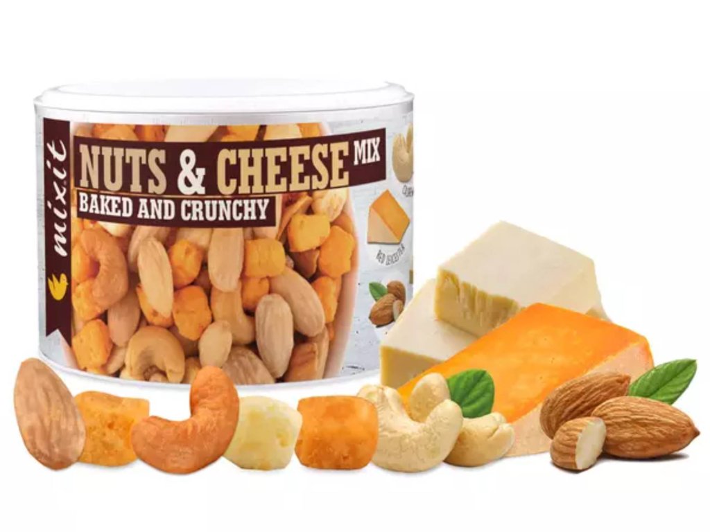 Složení: Pražená jádra kešu ořechů 39,2 %, loupané mandle pražené a solené 39,2 % (mandle 98 %, jedlá sůl 1,5 %, řepkový olej 0,5 %), Red Leicester 10,8 % (pasterizované kravské mléko, jedlá sůl, mléčná startovací kultura, syřidlo, přírodní barvivo: annatto), Cheddar 10,8 % (pasterizované kravské mléko, jedlá sůl, mléčná startovací kultura, syřidlo)