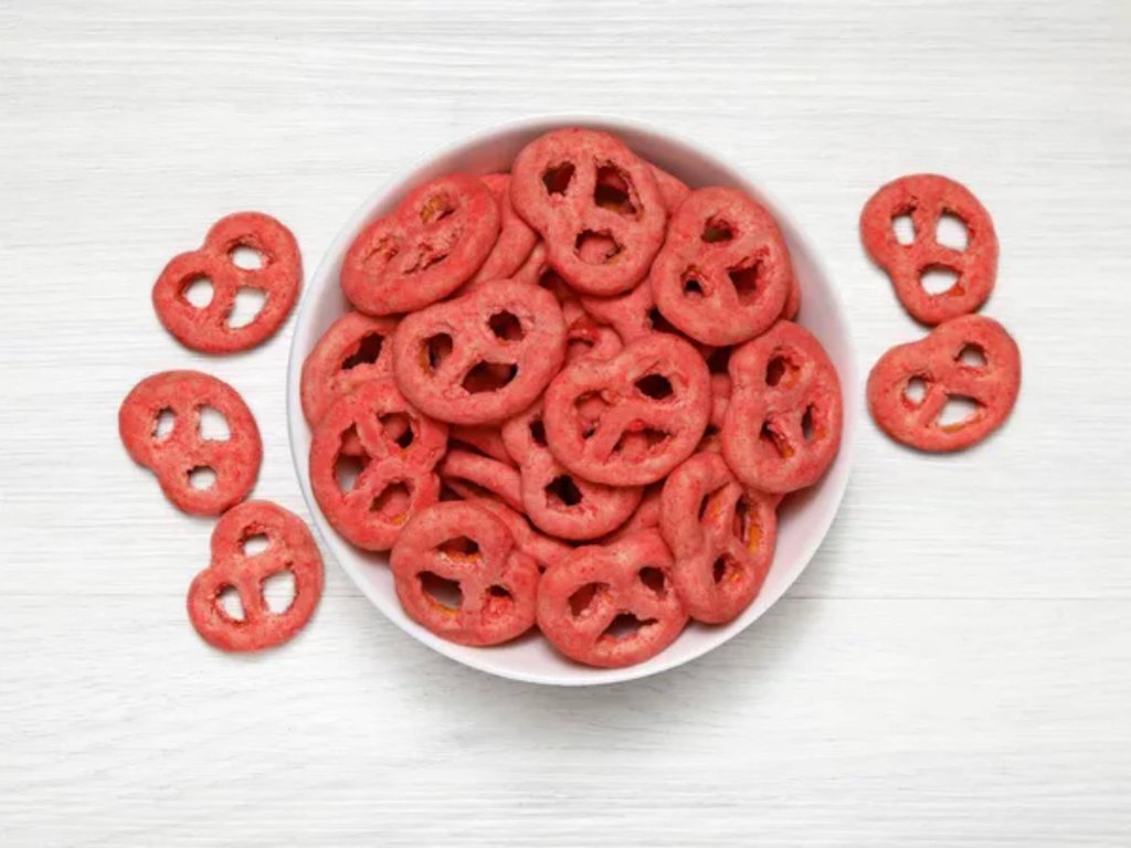 Křupavé preclíky v bílé čokoládě s jahodovo-jogurtovou příchutí.