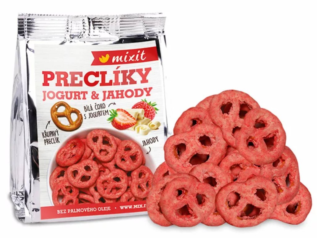 Složení: bílá čokoláda s jogurtovou příchutí 63 % (cukr, kakaové máslo, sušené mléko, sušený jogurt 2,5 % (mléko, jogurtová kultura), regulátor kyselosti: kyselina citrónová; emulgátor: lecitiny; vanilkový extrakt, přírodní jogurtové aroma), preclíky solené 32 % (pšeničná mouka, řepkový olej, jedlá sůl 2,3 %, mořská sůl 1,2 %, regulátor kyselosti: hydroxid sodný; droždí, ječný sladový výtažek, kypřící látka: hydrogenuhličitan sodný), prášek z mrazem sušených jahod 5 %.