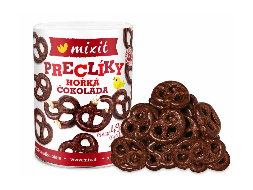 Složení: hořká čokoláda 65 % (cukr, kakaová hmota, kakaové máslo, emulgátor: lecitiny; přírodní vanilkové aroma, sušené mléko), preclíky solené 33 % (pšeničná mouka, řepkový olej, jedlá sůl 2,3 %, mořská sůl 1,2 %, regulátor kyselosti: hydroxid sodný; droždí, ječný sladový výtažek, kypřící látka: hydrogenuhličitan sodný), leštící látka: arabská guma; cukr, med. V hořké čokoládě obsah kakaové sušiny nejméně 49 %.