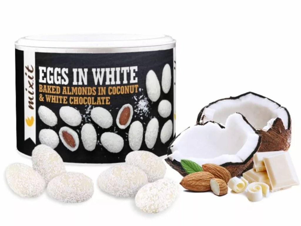 Andělsky bílé, nebesky dobré! Splnili jsme přání milovníků kokosových vajíček a naplnili jimi celý tubus! Vychutnejte si pražené mandličky v bílé čokoládě posypané strouhaným kokosem. Chuťový zážitek nabízíme opět bez palmového oleje a umělých aroma.