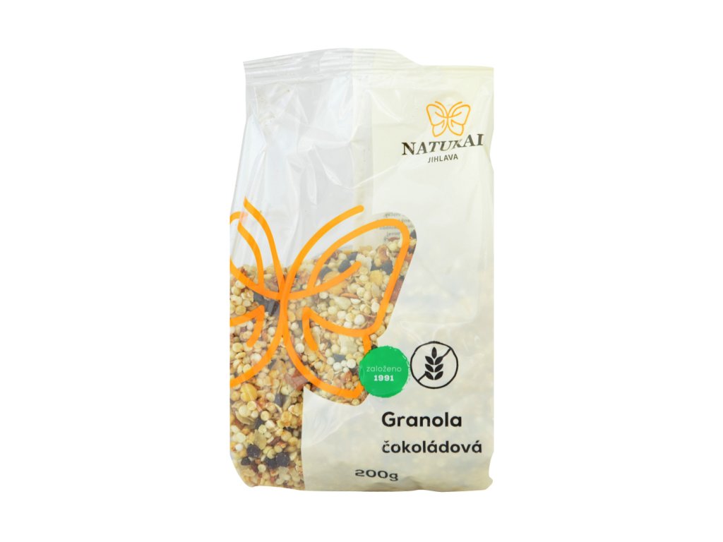 Bezlepková čokoládová granola je chutná směs vloček, semínek a čokolády, která je výtečná s jogurtem, mlékem i jen tak samotná. Je vhodná i pro celiaky, jelikož neobsahuje lepek. Tato směs obsahuje sójové, jahelné, rýžové a pohankové vločky, semena slunečnice a kousky čokolády, takže je kvalitním zdrojem vlákniny, minerálů i bílkovin. Lehce sladkou chuť tomuto zapečenému müsli dodává rýžový sirup a ovocný cukr.