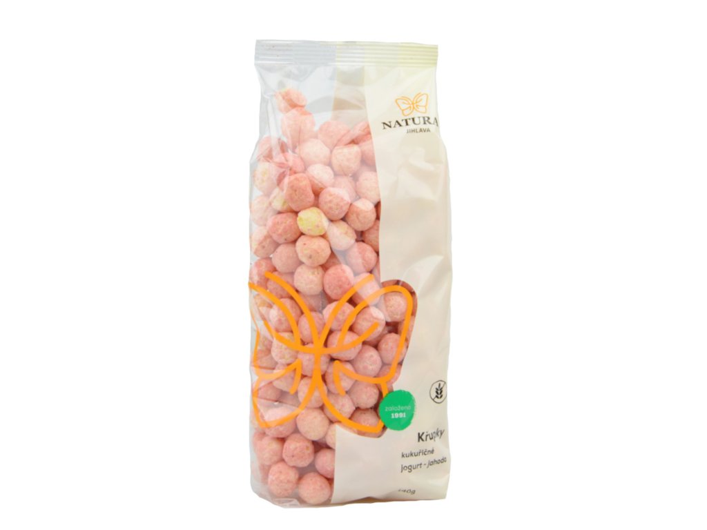 Výborné extrudované kukuřičné křupky s jogurtovo-jahodovou příchutí.