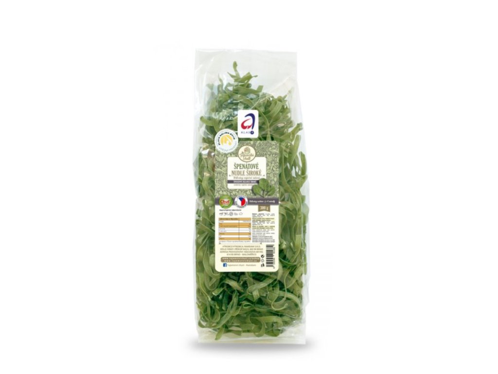 Složení: Pšeničná mouka, voda, mletý špenát min. 3%, sušená vaječná směs 2%