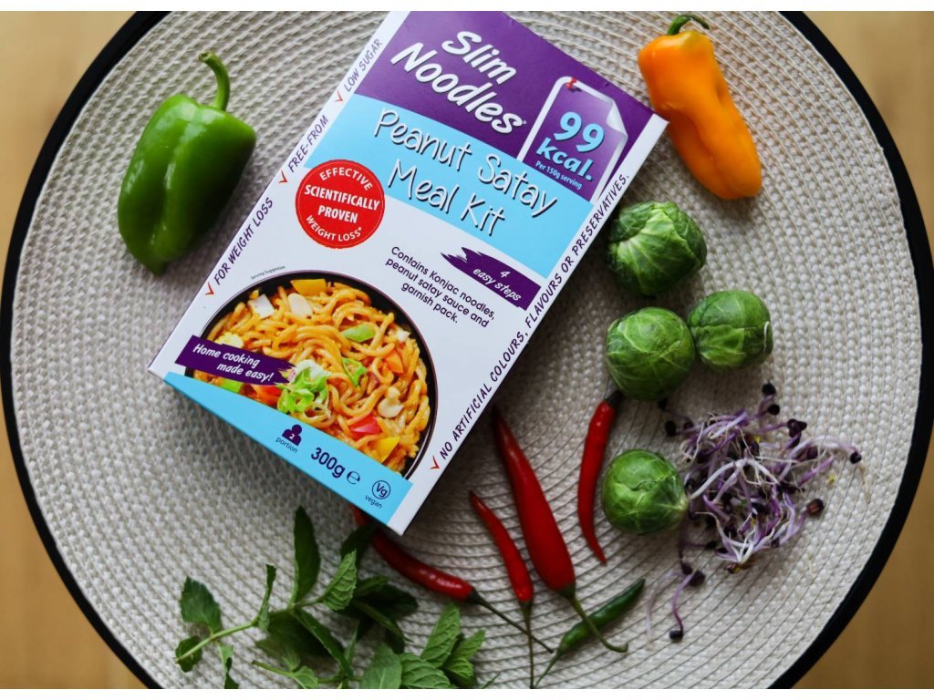 Obsah balení: konjakové nudle, arašídová Satay omáčka, balíček s kořením.